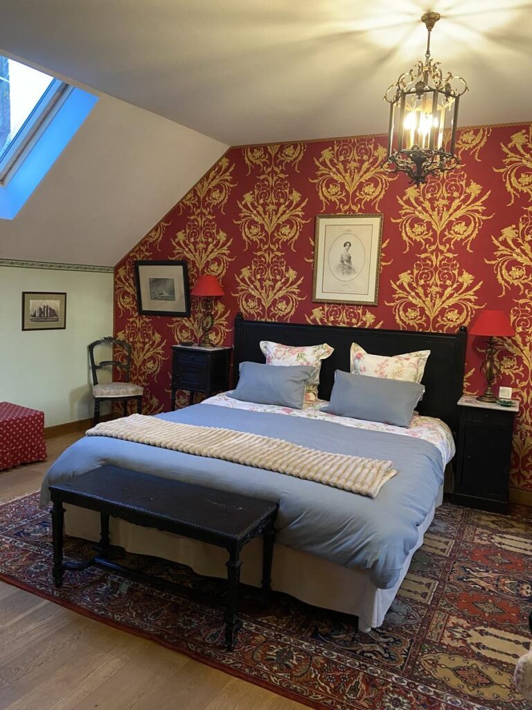 Toile de Jouy rouge et or, parquet de chêne et poutres apparentes. Lit double King size 180 x 200. Mobilier ancien.