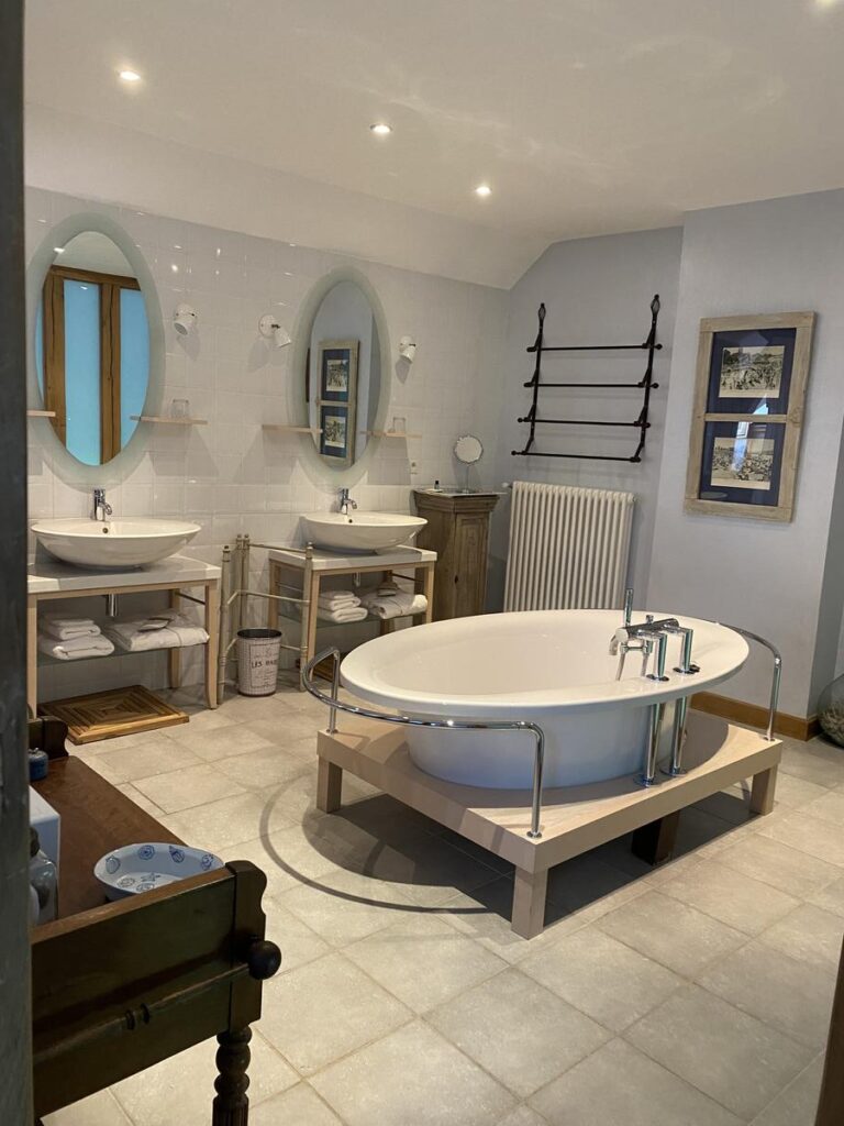 Salle de bains en suite : 20 m2, baignoire en îlot, double vasques, WC séparé.