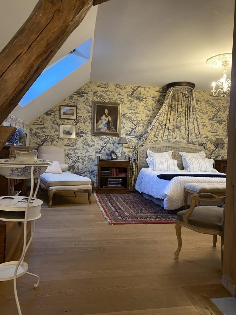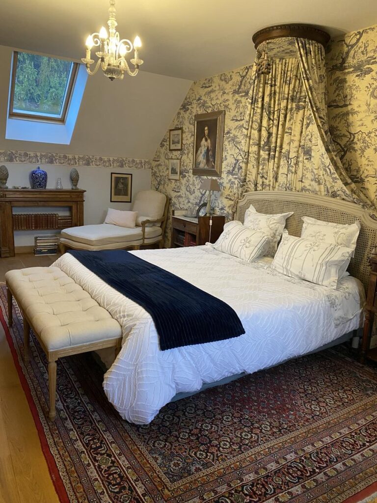 Toile de Jouy bleue et blanche, avec son ciel de lit qui met en évidence l’atmosphère chaleureuse de la chambre. Mobilier ancien. Parquet en chêne et poutres apparentes, lit double King size de 180 x 200.