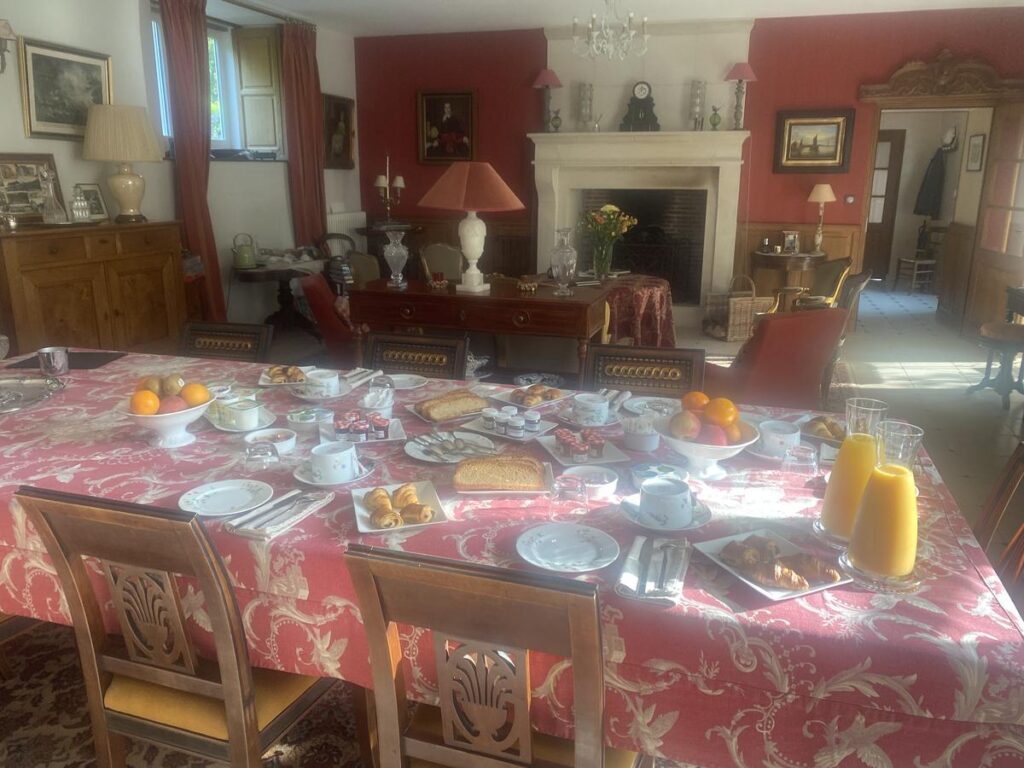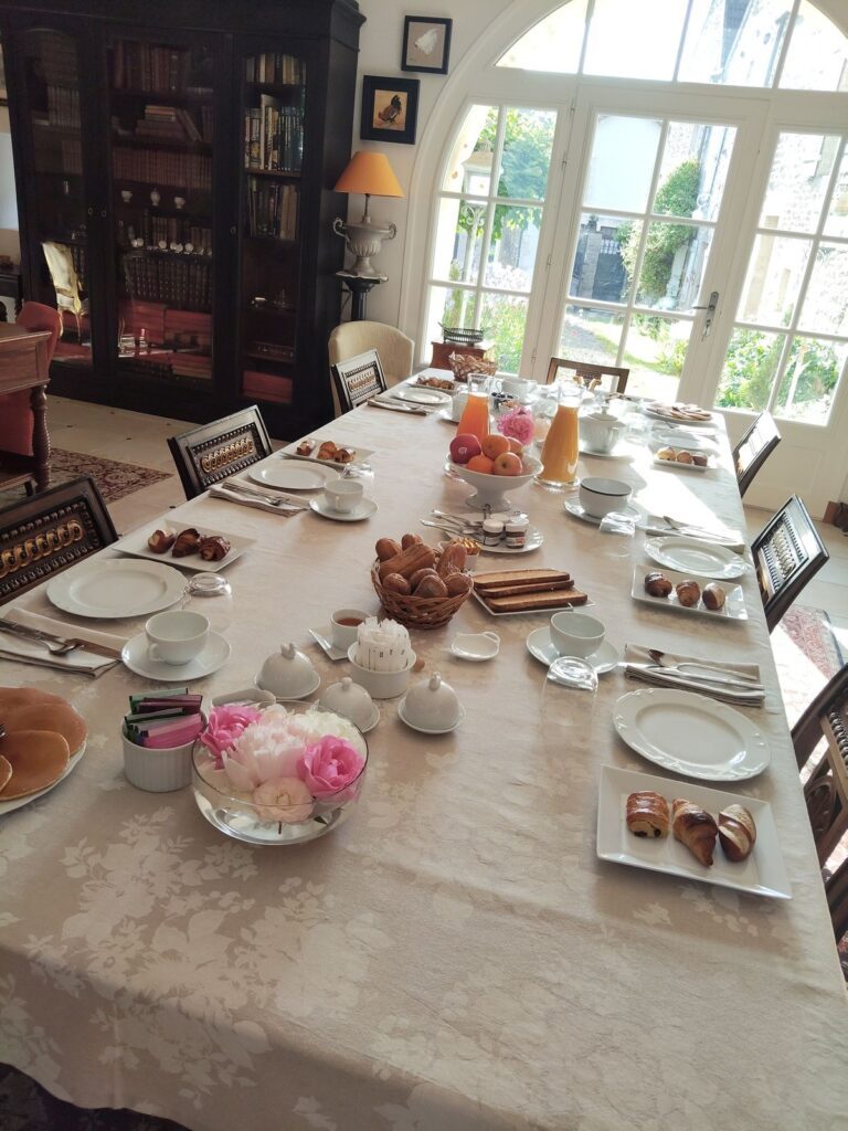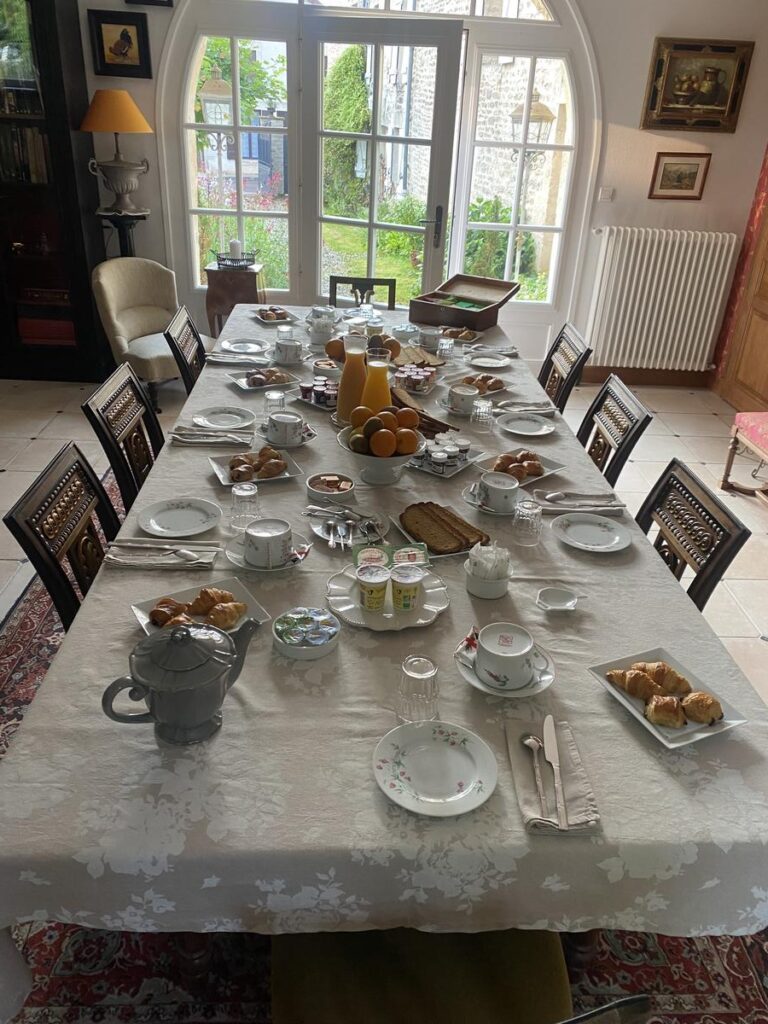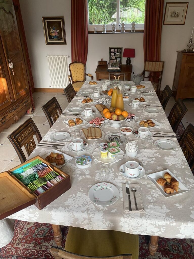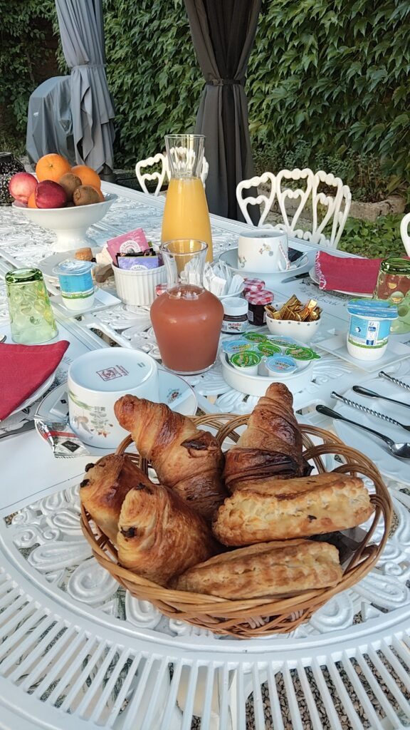 Nous vous proposons des boissons chaudes, thé, café, chocolat maison, fruits de saison, de la baguette fraîche, gâteau ou brioche fait maison ou viennoiserie, yogourt, choix de confitures maison, assortiment de fromage et de charcuterie de Bourgogne, jus de fruits.